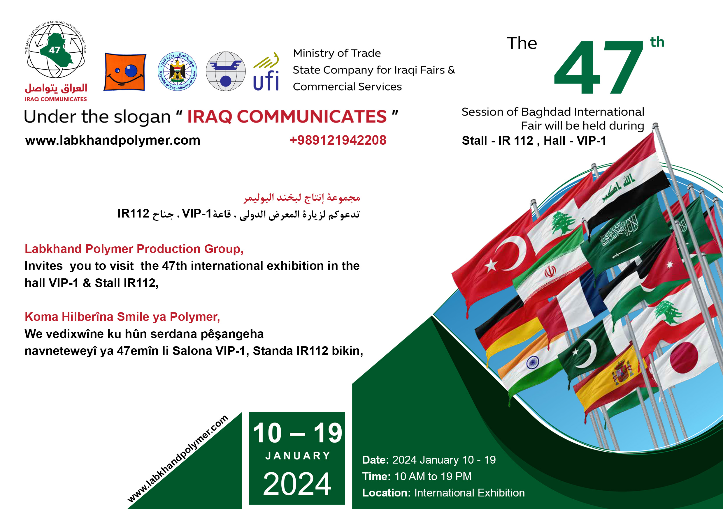 20 لغایت 29 دی ماه 1402 زمان - تاریخ میلادی 2024 - January 10 to 19 ساعت بازدید : 10 صبح الی 21 مکان : محل دائمی نمایشگاه بین المللی عراق International Exhibition Iraq - Baghdad شماره تماس : 09121942208نقشه نمایشگاه بین المللی بغداد - عراق نمایش پلان نمایشگاه